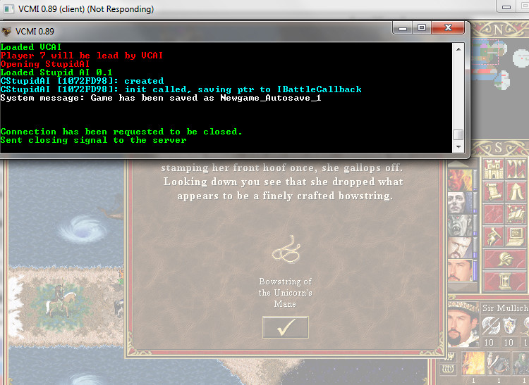To reproduce, take Sir Mullich in the map from 0001063 and press the Up Arrow to move. It will pick the artifact just above but afterwards, once he has to move first before getting to the next, holding Up Arrow for continuous move will lead to freeze when he gets to the artifact. You will have to minimize the client window and restore in order to get the pop-up message we get when we pick the artifact, but that doesn't help much as the game is still frozen. I tried to fiddle further with alt+tab, minimize+restore, L-/R-clicks, but the only result is what you see in the screenshot (client got an extra translucent blur on top). |