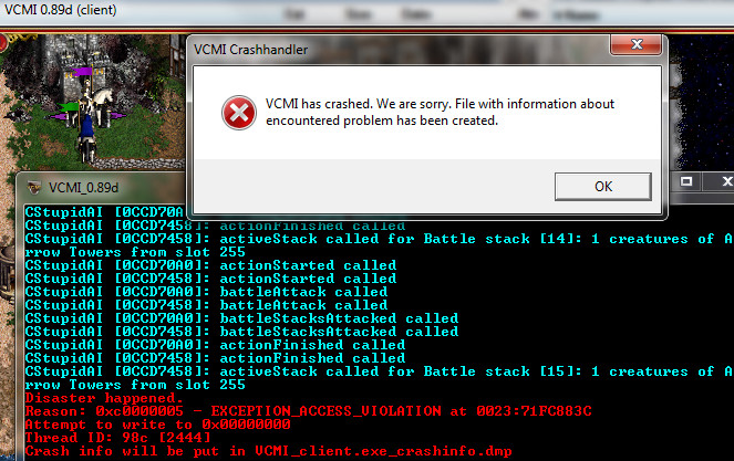 | Description | Seems always reproducible (3 out of 3): take VCMI_Tests_2011b map from the standard packages, and just hit End Turn. When Green attacks Purple Inferno town the game crashes.