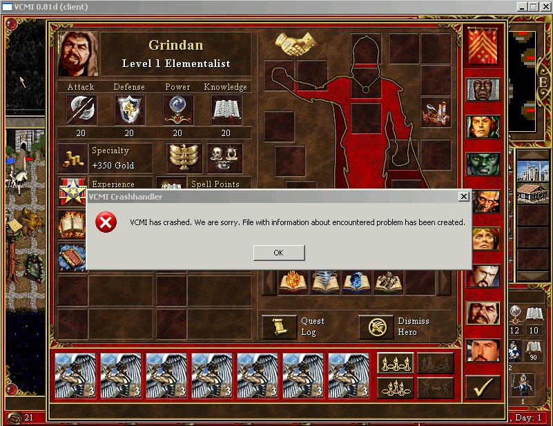 just to clarify. I played it few times later and everything was ok, also I've made some test with exp in pandora's box and it was ok, too. So maybe it is only coincidence that it happened during checking Ivan's rev. EDIT: One more thing. Take a look in txt log at "System message: Server encountered a problem: There is no stack on 58 tile (no attack)!" it was during comp turn and champions attack. It happened 2 times. It is more lass connected with http://bugs.vcmi.eu/view.php?id=560. [^] When I played this battle in MP, I had same situation I attack 2-hex stack with 2-hex stack and attack wasn't possible cause unit couldn't be placed in right position. "System message: Server encountered a problem: We cannot move this stack to its destination Champions" It is included in VCMI_client_log no.2 from crashes 0000559: http://bugs.vcmi.eu/file_download.php?file_id=501&type=bug [^] EDIT2: And maybe, computer during champions attack, attacked AA from back. But I'm not sure about that. And I don't know if after the crash happened during battle it could be possible to choose skills and go into hero's screen? Crash handler appears in background. |