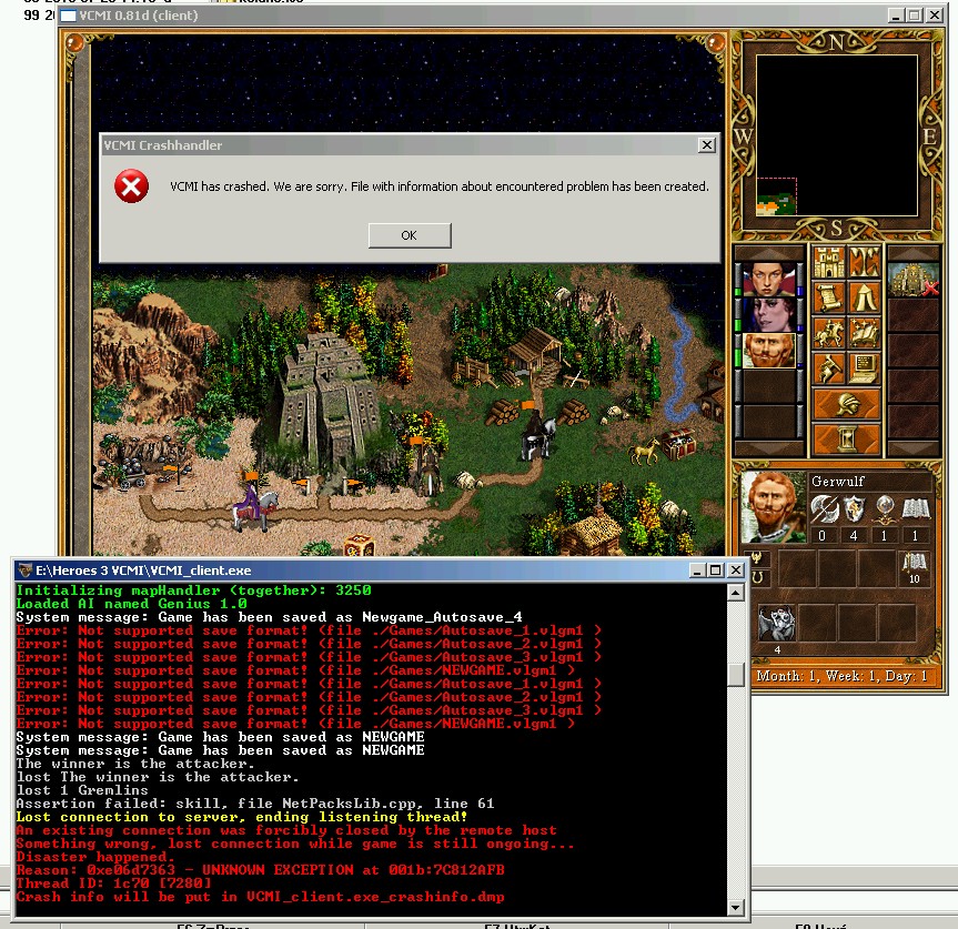 1) Dump is meaningless, since there is only client dump not the server one. According to the logs there should be both, so please look for VCMI_server.exe_crashinfo.dmp 2) Same here (client says it crashes cause server crashed) but this time there is no trace of server crashdump, it must have died silently. Most likely it was that failed assertion. |