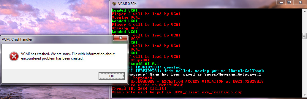 | Description | As the summary says, this happens only when we're on Adventure map (from battles it works fine, and from Main Menu the feature is not implemented yet). Two different types of crashes, depending on how we try to enable full screen: 1. If we try from System Options, the resolution of our desktop changes, but the client interface appears totally out of focus (its upper left corner close to the center of our screen). Soon after it also gets the "(Not Responding)" text in the title bar. Crash dump is not automatically created, so I had to force it (see first 2 attachments). Next time we launch the application, the client is still in windowed mode. 2. If we try using F4, the Adventure map does go to a properly centered full screen, but the game crashes as soon as we try to do any action. Crashdump automatically created now (see next 2 attachments). When we launch the application again, this time the full screen mode setting is saved and working correctly. [In this case we also lose control of the mouse: I was not able to use it to move the Crashhandler box above the console, or to access my usual screen capture application - I had to use the PrintScreen button on my keyboard, and then kill the app, in order to go to an image editor to crop & save the screenshot] Note: going back from full screen to windowed mode does not lead to similar crashes. | ||||||||