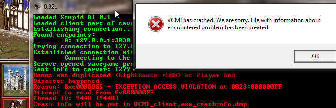 | Description | Map is VCMI_Tests_2012, Castle town is fully built from Map Editor (Grail included), except for Tavern. We can build Tavern if we start a new game, but if it's loaded from a save, the game crashes. As per screenshots, sometimes it crashes just before, sometimes just after the Tavern appears in the town screen. Crashdump + save attached (game saved at start, no actions before). This was not there in 0.92. I cannot test if it's introduced in 0.92b, because in there we couldn't build anything in a loaded game. This is a split from a discussion started in the notes of 0001272. As posted there, Ivan found it's something with the bonus system (duplicate lighthouse bonus? - see also console message in 2nd screenshot pointing the same): Crash on server, stacktrace: 0 ?? 0x3266250 1 CBonusSystemNode::unpropagateBonus HeroBonus.cpp 817 2 CBonusSystemNode::removeBonus HeroBonus.cpp 783 3 CGTownInstance::recreateBuildingsBonuses CObjectHandler.cpp 2489 4 NewStructures::applyGs NetPacksLib.cpp 444 5 CApplyOnGS<NewStructures>::applyOnGS CGameState.cpp 72 6 CGameState::apply CGameState.cpp 1849 7 CGameHandler::sendAndApply CGameHandler.cpp 2150 8 CGameHandler::sendAndApply CGameHandler.cpp 2182 9 CGameHandler::buildStructure CGameHandler.cpp 2486 10 BuildStructure::applyGh NetPacksServer.cpp 113 11 CApplyOnGH<BuildStructure>::applyOnGH CGameHandler.cpp 87 Maybe someone familiar with the bonus system can take care of it; and maybe also check if we can expect a similar bug on other towns. | ||||||||