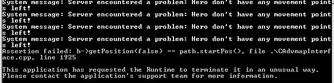 | Description | Crash always reproduce because of this bug. " System message: Server encountered a problem: Hero don't have any movement points left! System message: Game has been saved as Autosave_22 Assertion failed: h->getPosition(false) == path.startPos(), file .\CAdvmapInterf ace.cpp, line 1925 This application has requested the Runtime to terminate it in an unusual way. Please contact the application's support team for more information." | ||||||||