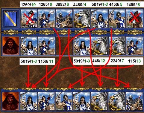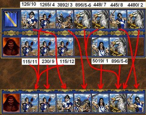 Found full description (but in Russian) on how this feature should work. Will translate later. 1.Когда в гарнизоне и в гостях есть герои - их армии не объединяются никогда. 2.В гарнизоне героя нет, а в гостях - есть: 2.1.Если суммарно в армии гарнизона и в армии героя не более 7 типов существ, то армии объединяются под руководством героя. 2.2.Если суммарно более 7 типов существ, то армии объединяются - в объединённой армии отсутствуют самые "слабые" отряды (видимо по AI values). В случае победы атакующего, он получает город. В случае победы защитника - "пропавшие" существа остаются в армии гарнизона, а участвовавшие в битве остаются в армии героя. 2.3.Если в гарнизоне один тип существ разделён на несколько отрядов, но всего у гостя и в гарнизоне не более 7 типов существ - армии объединяются (разделённые отряды сливаются в один). 2.4.Если в гарнизоне один тип существ разделён на несколько отрядов, и суммарно у гостя и в гарнизоне более 7 типов существ, то армии объединяются - разделённые отряды сливаются в один, в объединённой армии отсутствуют "самые" слабые отряды. 2.5.Если у героя один тип существ разделён на несколько отрядов, то армии объединяются - в объединённой армии отсутствуют самые "слабые" отряды (разделённые отряды НЕ сливаются в один). |