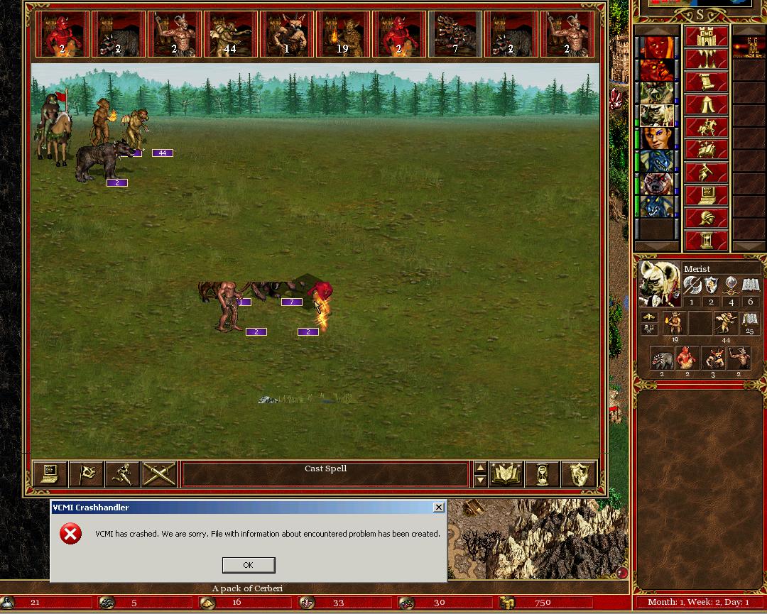 Added crash while attacking cerberi, 2-hex creature retaliated against efreeti. Another thing (I think related to this one), before this round I've attacked with efreeti (after wait) against cerberi there appeared note "System message: Server encountered a problem: There is no stack on 92 tile (no attack)!" |