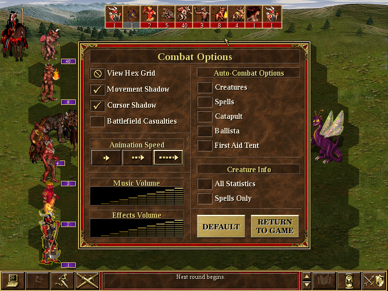 | Description | Just what the summary says. The button for battlefield casualties doesn't work, none of the auto-combat options work, the creature info buttons don't work, and the music/effects volume selection doesn't work at all. |