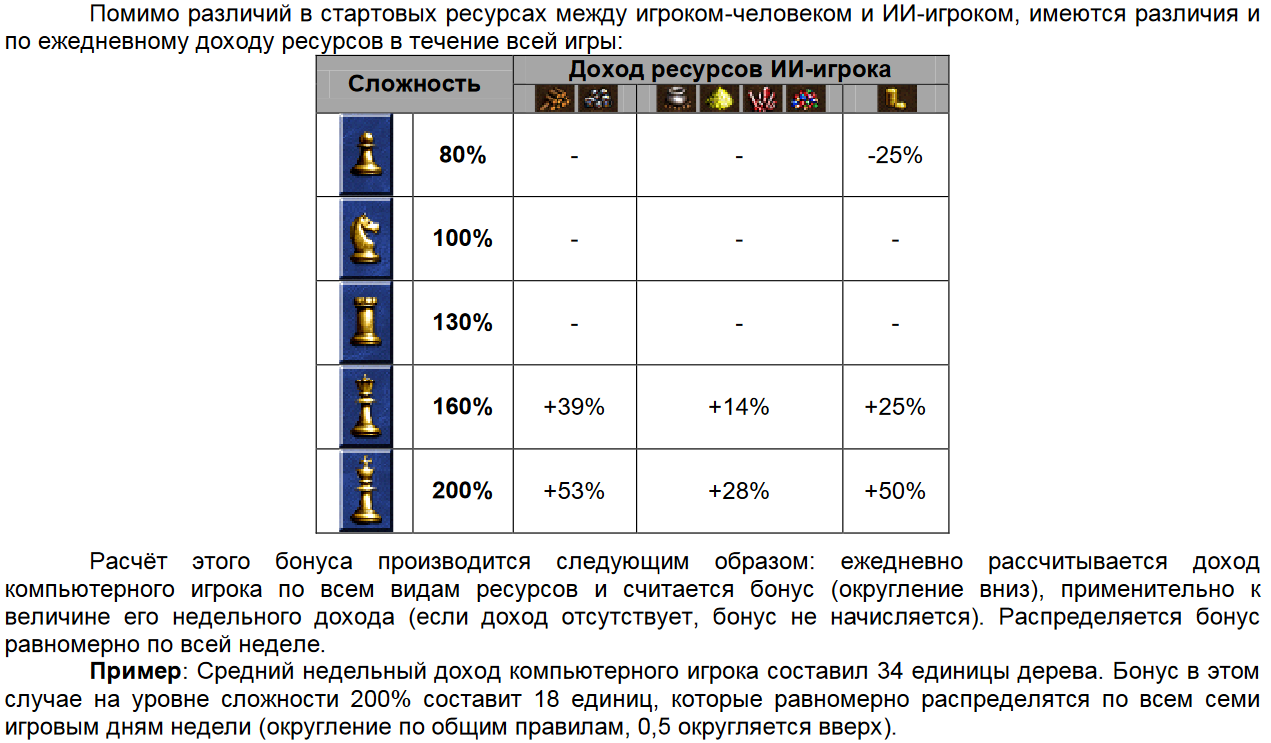 | Additional Information | I just did basic testing just to confirm there is bonuses, but I didn't attempted to check exact formula. Results from my testing map that compensate human player for 200% difficulty: Daily income: 2, 1, 2, 1, 1, 1, 1500 Start resources: 15, 7, 15, 7, 7, 7, 10000 Week 2, day 1 human: 29, 14, 29, 14, 14, 14, 20500 Week 2, day 1 AI: 36, 16, 35, 16, 16, 16, 25750 | ||||||||||||