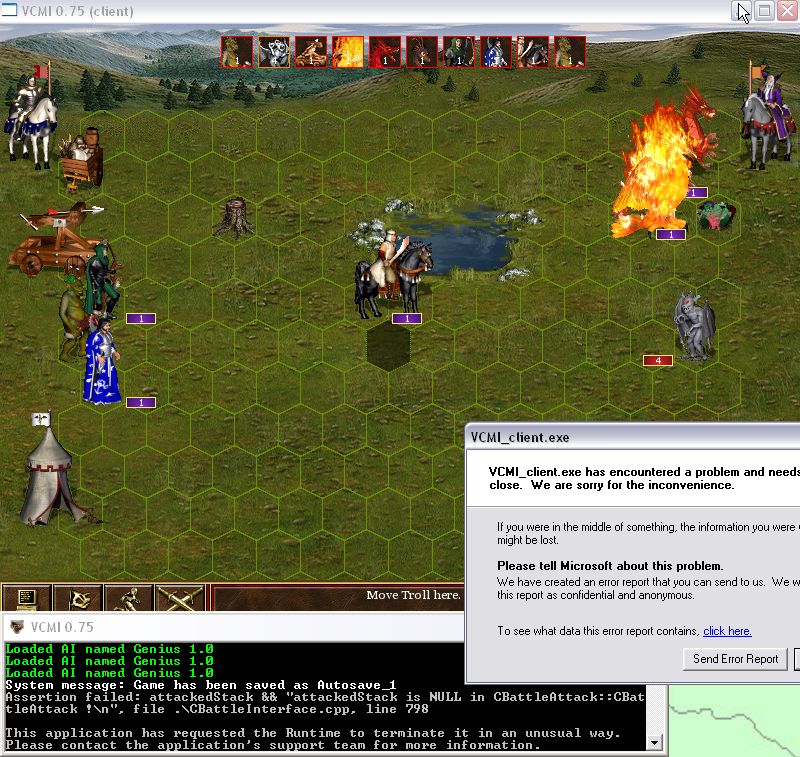 It happened again. See newly attached screenshot & logs (archive includes saved game as well). Again no .dmp file was created. To try to reproduce (as it's hardly possible), load the attached game and attack the orange hero with Sir Mullich. In the battle, I simply attacked with all troops in round 1, until Troll's turn came. When I gave the Troll the instruction to move to the shaded hex (see screenshot) the game crashed. I can't find a pattern though: - I fought the battle 10 more times, trying to use the same actions, I had the crash only 3 times - The 3 times it crashed were in battles started with (Mass) Slow. However there was a 4th battle which started with (Mass) Slow, that didn't crash on Troll's move, so casting may be a misleading path. |