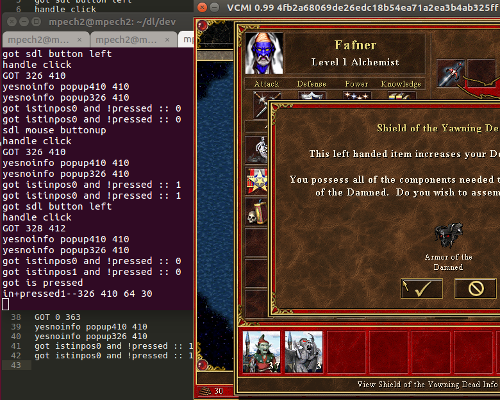 if this can help.. In capture GUI... proper_settup image is when: left hand hero is free. I put there the shield of yawning dead. yesnopopinfo shows. then I click the validate button (top left corner). coordinate of the click is 328/412 void CGuiHandler::handleMouseButtonClick(CIntObjectList & interestedObjs, EIntObjMouseBtnType btn, bool isPressed) { std::cout<<"handle click"<<std::endl; auto hlp = interestedObjs; std::cout<<"GOT "<<current->motion.x<<" "<<current->motion.y<<std::endl; wrong_offset_image is when: shield of the damened is equiped. I put there the shield of yawning dead. yesnopopinfo shows. then I click the validate button (top left corner). coordinate of the click is now 349/434 (so about 21pixels offset) |
