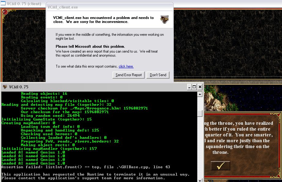 Additional InformationI rarely get a similar error when closing the Adventure Map window from its upper right corner, but I'm not sure if it's related (I cannot reproduce it yet, in order to attached logs - so it could be related to some action in the game and have nothing to do with the cause of error in this report)