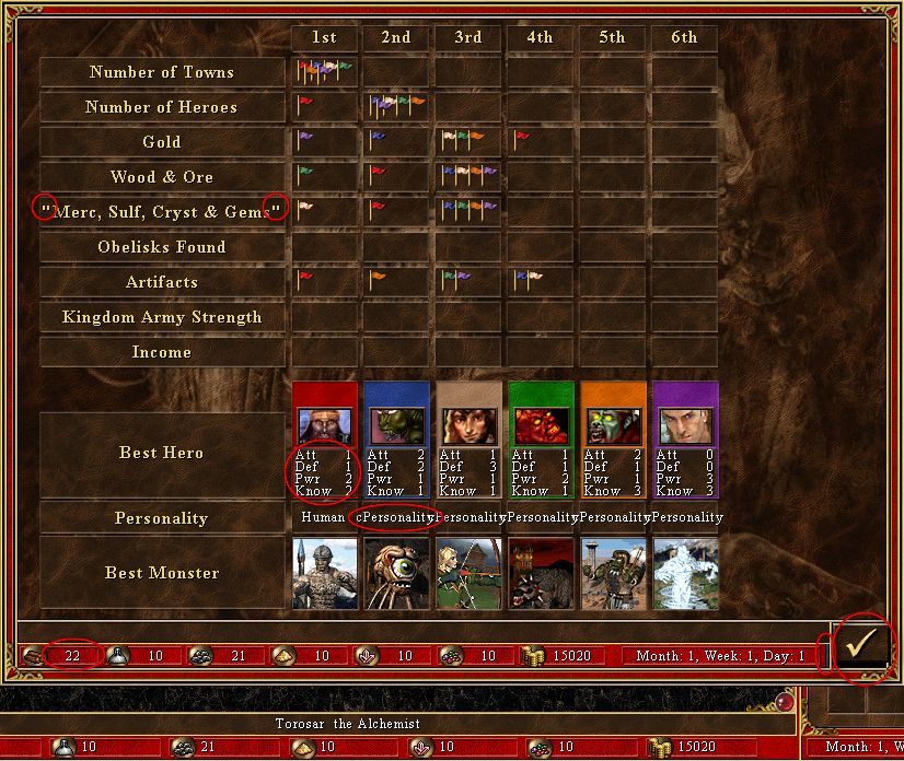 | Description | You probably know some of them, but here is what I noticed so far: a) [FIXED] Redundant quotation marks for precious resources b) [FIXED] Fonts for heroes' primary skills c) AI personalities missing, placeholder "cPersonality" does not fit in the cell d) All resources but Gold are placed too much to the right e) [FIXED] Resource Bar does not have the proper length (see a few blue pixel columns in the right end) f) [FIXED] Wrong Check button - the one in VCMI now is probably the one used for other screens; but Thieves' Guild actually has a button which is not so wide but is bigger on the vertical. g) flags are not centered. h) some fields are not implemented yet. i) ESC does not close window. | ||||||||