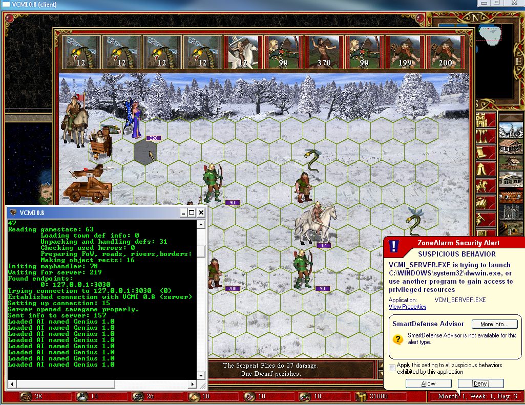 | Description | This one happened while I was trying to reproduce 0000404. No crashdump created (only logs attached), but it's easier to reproduce. It happens always if you attack the Dragon Fly Hive directly after loading the savegame attached to 0000404. It's always the same: When I attack (any Serpent Fly) with my Sprites, I get the firewall msg that VCMI tries to launch system32\dwwin.exe while the Sprites are still flying towards the victim. The Sprites manage to complete their attack and also one of the Serpent Fly stacks performs its attack. Normally after that it should still be the turn of the other Serpent Fly stacks, but nothing happens anymore (no creature active). I can still R-click creatures on the battlefield and see their card, click on buttons, but I cannot continue the battle itself. The only way to get a crashdump file is, after the freeze above, to open the spellbook and try to cast a spell. I'm attaching it below the screenshot, but feel free to remove it (to save space) if it's irrelevant. | ||||||||