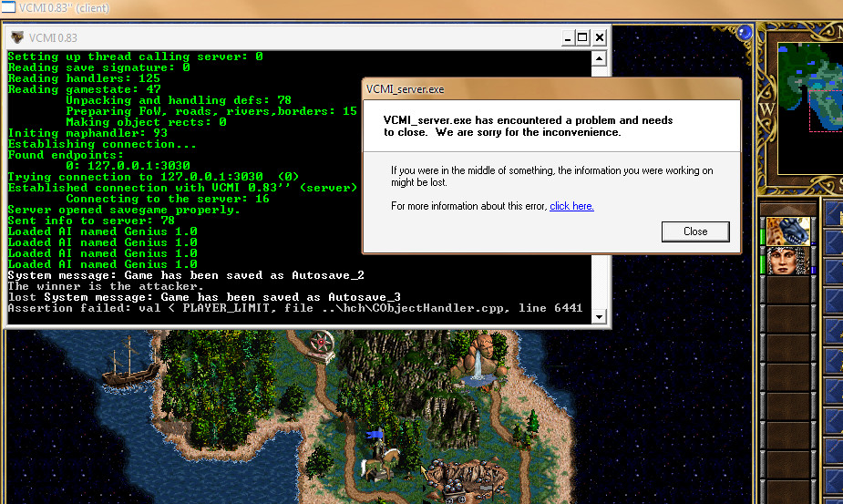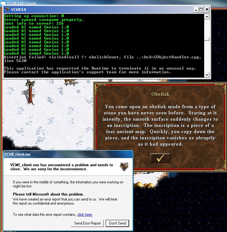 | Description | It happened only once [EDIT: since 0.82/83 the chance of occurrence seems to have increased]. I loaded Autosave_3 savegame attached and I tested different digging options: with hero in town (correct "Try searching on clear ground" msg), by pressing "D", by using the button where there's no grail and finally digging out the grail. After I also visited the obelisk, but I got the crash. No dmp file created. Logs attached. | ||||||||