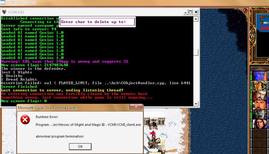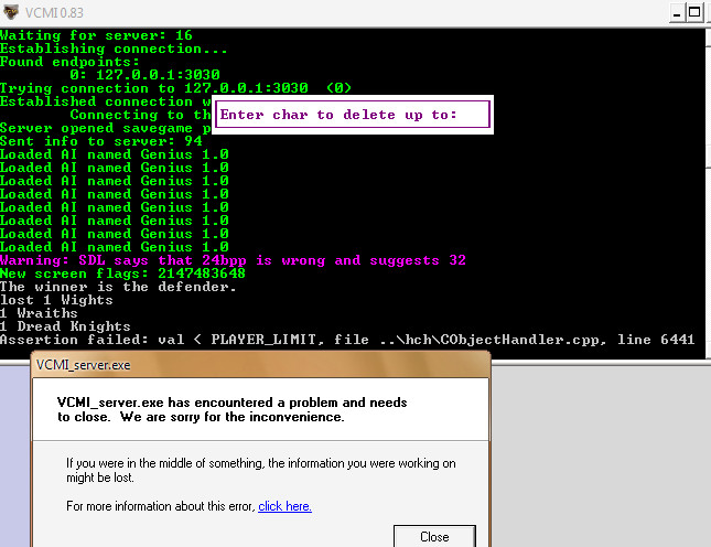I managed to reproduce it. I get a new pop-up saying "Enter char to delete up to:" as you can see in the screenshots. Unfortunately no crash dump created. But I attached the logs and the saved game. To reproduce, just load the saved game in the newly attached archive and visit the Obelisk with Ivor. It can only be reproduced with the saved game. With new game it works fine. There were not particular actions I took before the crash. I started the map (the one from 0000091), went to Redwood Observatory with Ivor, then towards the Obelisk, hit End Turn, save, load, go to Obelisk. |