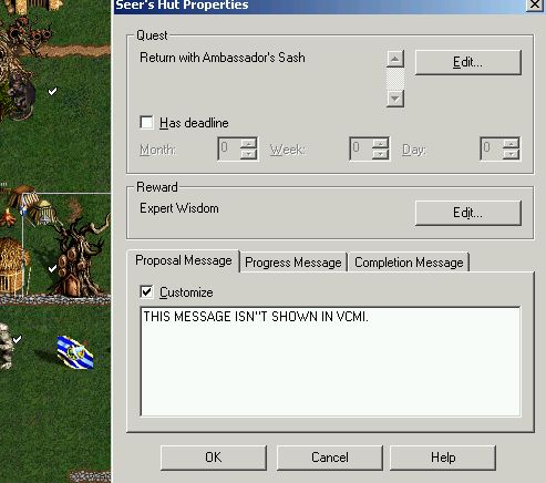 I think it is in all types. In properties to all kind of quests you have default/standrad messages: proposal, progress and completion, but you are able to customize this messages and write what you want. If you make it in mapedit VCMI still shows standard message. PS. Troche moze moja wina bo jak robilem mapke z wszystkimi rodzajami questow to nigdzie nie zmienialem tej wiadomosci. |