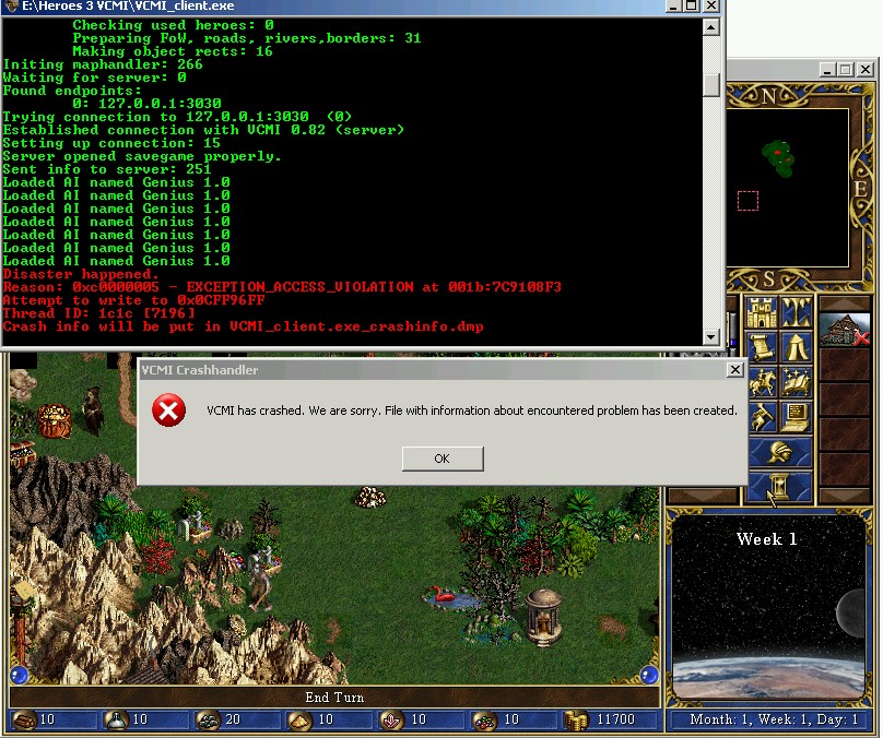 This problem still exist in 0,82 Probably related to 0000556 (http://bugs.vcmi.eu/view.php?id=556 [^]) EDIT: Seems that it is also related with going back to main menu. I've added new save. Start VCMI, load it, you can end turn (should be ok), but go to main menu, load it again and then end turn - now the interface should be crashed. EDIT2: Unfortunatly it is not always reproducible. But I've just got crash during testing this problem. (added screenshot and logs) |