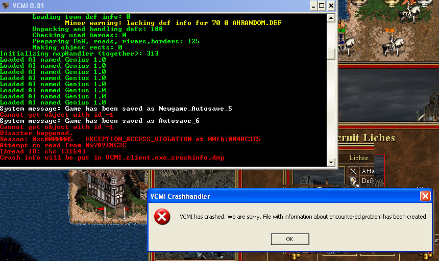 | Steps To Reproduce | You can use map attached to 0000515. When the game starts, open immediately the town screen of the Tower (1st town in the list), then the Gremlin dwelling, then R-click on the creature card to see its stats. So it's reproducible for all in-town dwellings (maybe also map dwellings, I didn't try). But if you want to reproduce the exact steps that led to the crash in the dump/screenshot attached, here's what I did: - Start map attached to 0000515 - Open Necropolis, build Graveyard - Exit town, End Turn - Open Necropolis, build Mausoleum - Open Mausoleum, R-click on Lich creature card | ||||||||