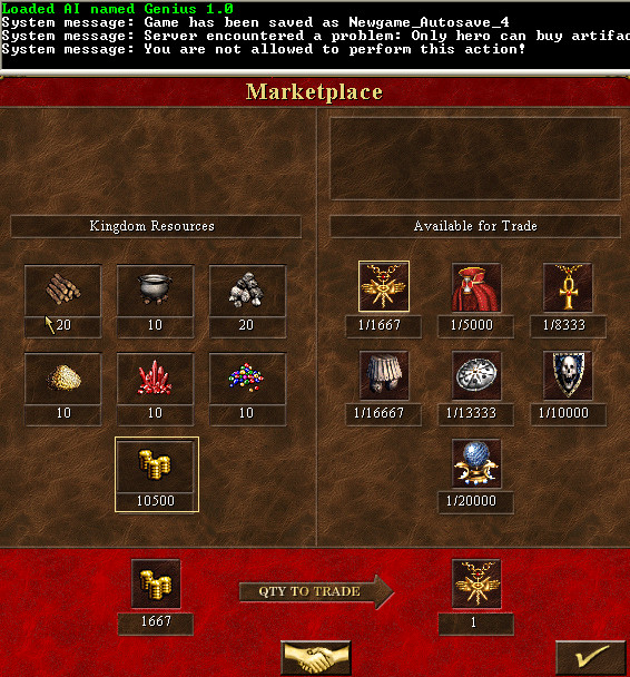 | Additional Information | Once most of these bugs are fixed, we should run more checks in parallel between H3 in VCMI in all 6 screens (Buy/Send resources, Buy/Sell artifacts, Sacrifice artifacts/creatures) for both in-town and on-map objects, to identify all discrepancies (if I'm available when the bugs are be fixed, I can run the tests myself). | ||||||||||||