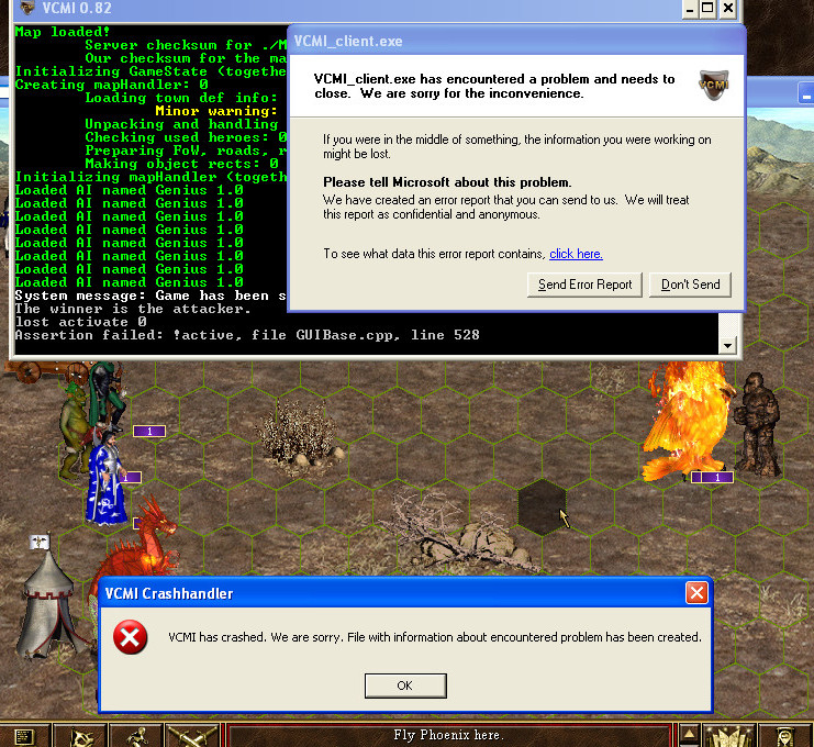 3. Another freeze sample - with the Console message and dump created after I typed "activate 0" in Console as Tow suggested (I had an exchange of PM's with him on the forum about it already, but he couldn't reproduce it). As seen in the screenshot, I didn't even have to attack to Earth Elemental - I just flew the Phoenix in front of it and the game froze. |