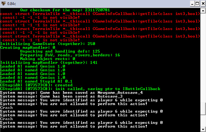 Should be fixed in r2158. Recent changes to framerate keeping code that made game run smoother also increased likelihood of encountering this bug. However this is only for freeze on new turn issue. Clicking end turn button very, very fast can confuse VCMI and lead to "not allowed to perform this action" message, but it should not cause any lasting problems (just some of the clicks will be ignored). I'm unable to reproduce issue with moving hero — actually it looks as there are two issues: not allowing to move hero during turn (that is 0000729, where apparently all actions became prohibited at some point) and freeze with a gallop sound, that most likely is a separate issue. @Zamolxis You have to type "crash", without capital 'C'. Commands are case-sensitive. |