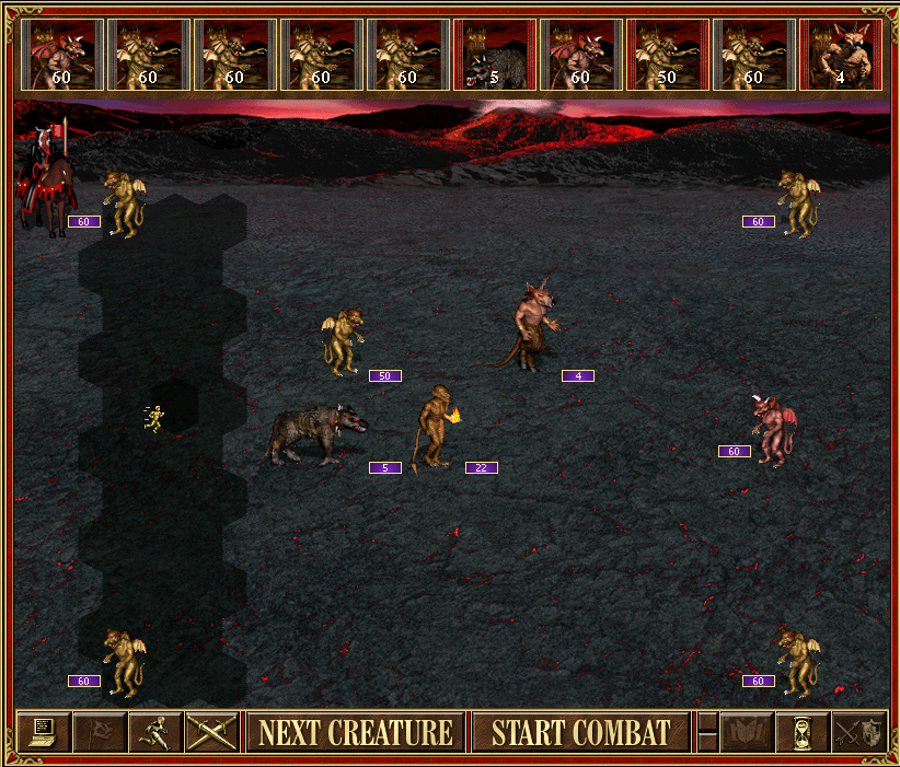 | Description | - (FIXED) Stack queue moves every time a stack in tactics mode is moved, even though it does not represent these stacks by any means. - (FIXED) Tactics work in creature banks. Moreover, flying monsters are able to move to left-side hexes avaliable via tactics. - (FIXED) Back hex for double-wide monsters is not highlighted and clikable, even though they cna move so their back ends in this place. - (FIXED) Next creature is highlighted (gold frame) before the previous one end movement. - (FIXED) If enemy creatures are faster than ours, highlighted tactics area won't vanish before they end their movement. If they attack our stack in this area, game crashes. - (FIXED) Monsters don't accept movement orders to tactics area if their path is not entirely within it (blocked by obstacles or other monsters). This is however discussable, as in H3 some absurd 20-hex runs were allowed. [Reported by Zamolxis in note] - (CHANGED) when hovering over enemy creatures during Tactics mode, instead of the question mark (which would open creature card if clicked) mouse cursor changes to arrow or sword; however if we click to attack, we get a message saying we are not allowed to perform the action; - (FIXED) we can open the spell book and cast spells; this one leads to crash | ||||||||