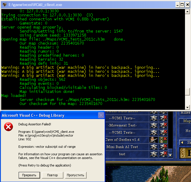 I tried several times but I don't have any luck reproducing the issue. Any chance you could try getting the stack trace when the crash occurs? That'd be helpful. Judging by the failed assertion dialog, you're using a VS debug build, so it should be right there. When the dialog appears, run Visual Studio, attach it to the VCMI process, and then in the dialog click Retry aka Повтор. Visual should activate and point the failed assertion. Then select call stack window (if it's not present, bring it up debug->windows->call stack), ctrl+a, ctrl+c and paste it here. |