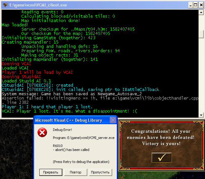 | Additional Information | Log files attached. Console output: Creating mapHandler: 15 Unpacking and handling defs: 16 Preparing FoW, roads, rivers,borders: 94 Making object rects: 31 Initializing mapHandler (together): 141 Opening VCAI Loaded VCAI Player 1 will be lead by VCAI Opening StupidAI Loaded Stupid AI 0.1 CStupidAI [070EEC28]: created CStupidAI [070EEC28]: init called, saving ptr to IBattleCallback System message: Game has been saved as Newgame_Autosave_2 Assertion failed: !!visitingHero == !h, file e:\game\vcmi\lib\cobjecthandler.cpp , line 2382 Player 1: I heard that player 1 lost. VCAI: Player 1 lost. It's me. What a disappointment! :( | ||||||||