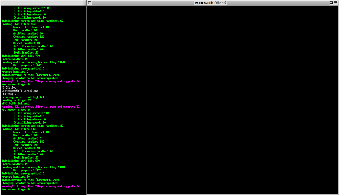 It means that there is mismatch between X color resolution and in-game one. Shouldn't affect game in any way. If you wish to remove that warning open file ~/.vcmi/config/settings.json and add this line in "video" section: "bitsPerPixel" : 32, Ok. Bug is in ColorPutter::PutColor method in SDL_Extensions.h:238 Now looking for a way to fix... |